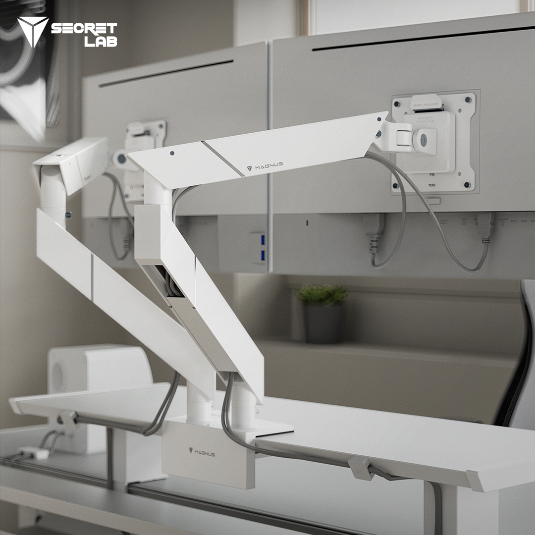 Mount up to a 34” monitor and free up space on your desk. Designed for your MAGNUS Pro, our MAGNUS Monitor Arm in Pure White feels like a seamless extension of your desk. Find the perfect ergonomic position for your screen and enjoy the full dynamic range of tilt, swivel, and rotation adjustments.